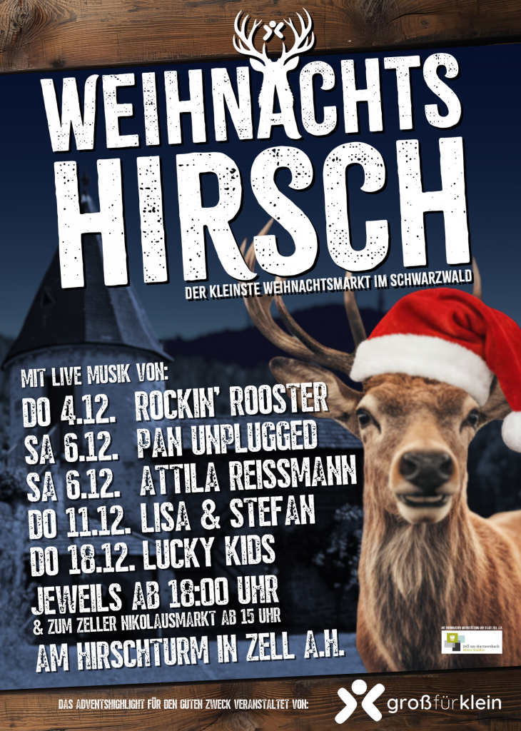Groß für Klein Zell e.V. veranstaltet in diesem Jahr den Zeller Weihnachtshirsch, den kleinsten Weihnachtsmarkt im Schwarzwald. Wir öffnen die Pforten am Do 4.12., Do 11.12. und Do 18.12. jeweils ab 18 Uhr, sowie zum Zeller Nikolausmarkt ab 15 Uhr. Weihnachtsstimmung für den guten Zweck! Mit Freunden genießen oder gemeinsam mit uns ein Zeller Weihnachts-Highlight für den guten Zweck schaffen.